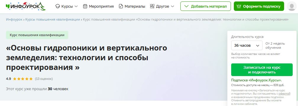 [Инфоурок] Основы гидропоники и вертикального земледелия: технологии и способы проектирования